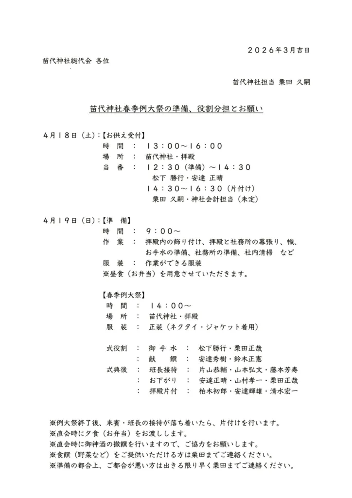 春季例大祭の準備と役割分担